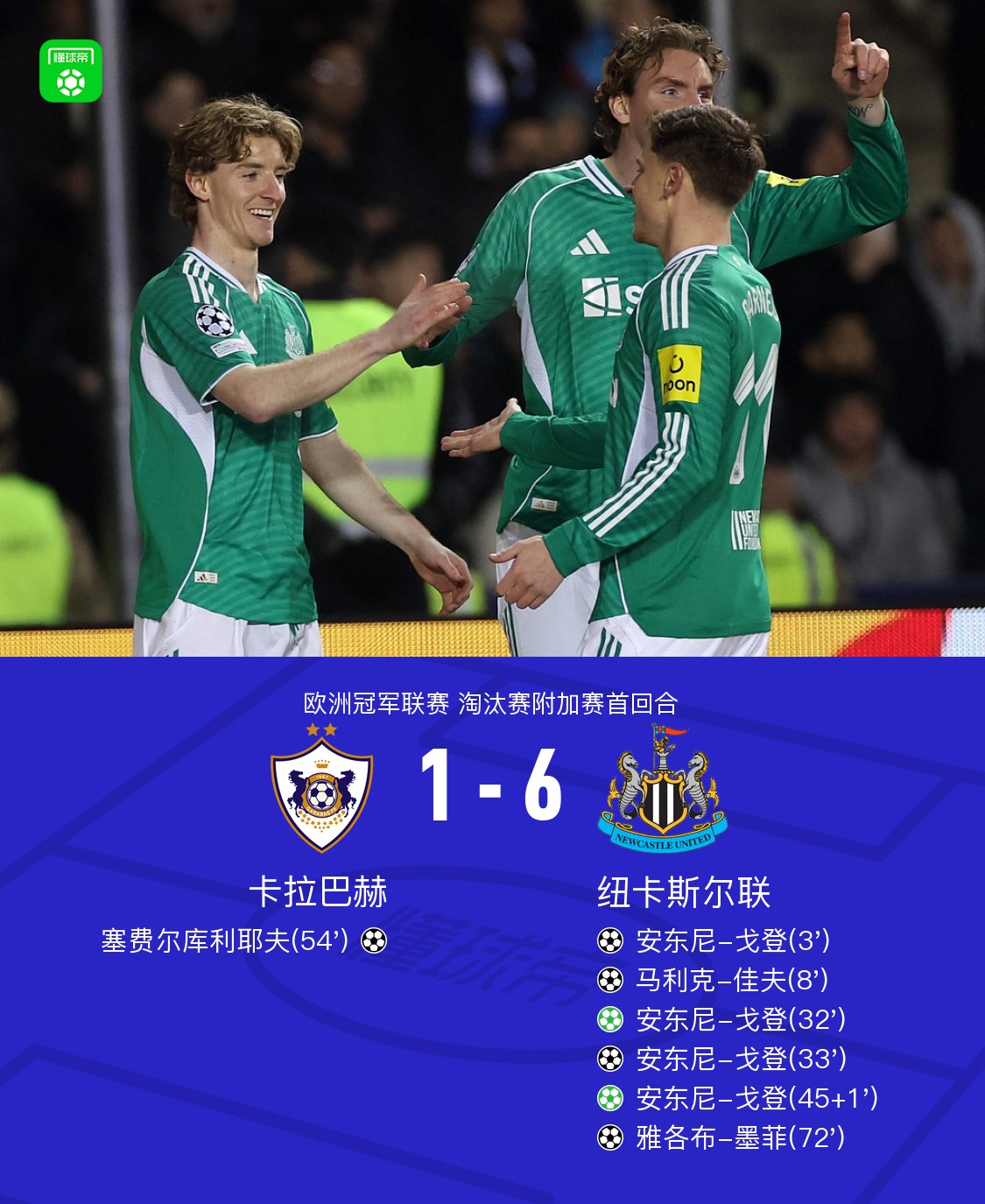 北京时间2月19日,欧冠淘汰赛附加赛首回合,卡拉巴赫对阵纽卡斯尔联。上半场,安东尼-戈登完成大四喜,马利克-佳夫头槌建功。下半场,塞费尔库利耶夫扳回一城,雅各布-墨菲替补破门。最终,纽卡客场6-1狂胜卡拉巴赫。点击查看本场比赛详细数据>>点击查看欧冠完整积分榜>>关键事件第2分钟,丹-伯恩送助攻,安东尼-戈登低射闪击,纽卡反客为主1-0!第8分钟,特里皮尔传中,马利克-佳夫2026-02-19 03:38:59